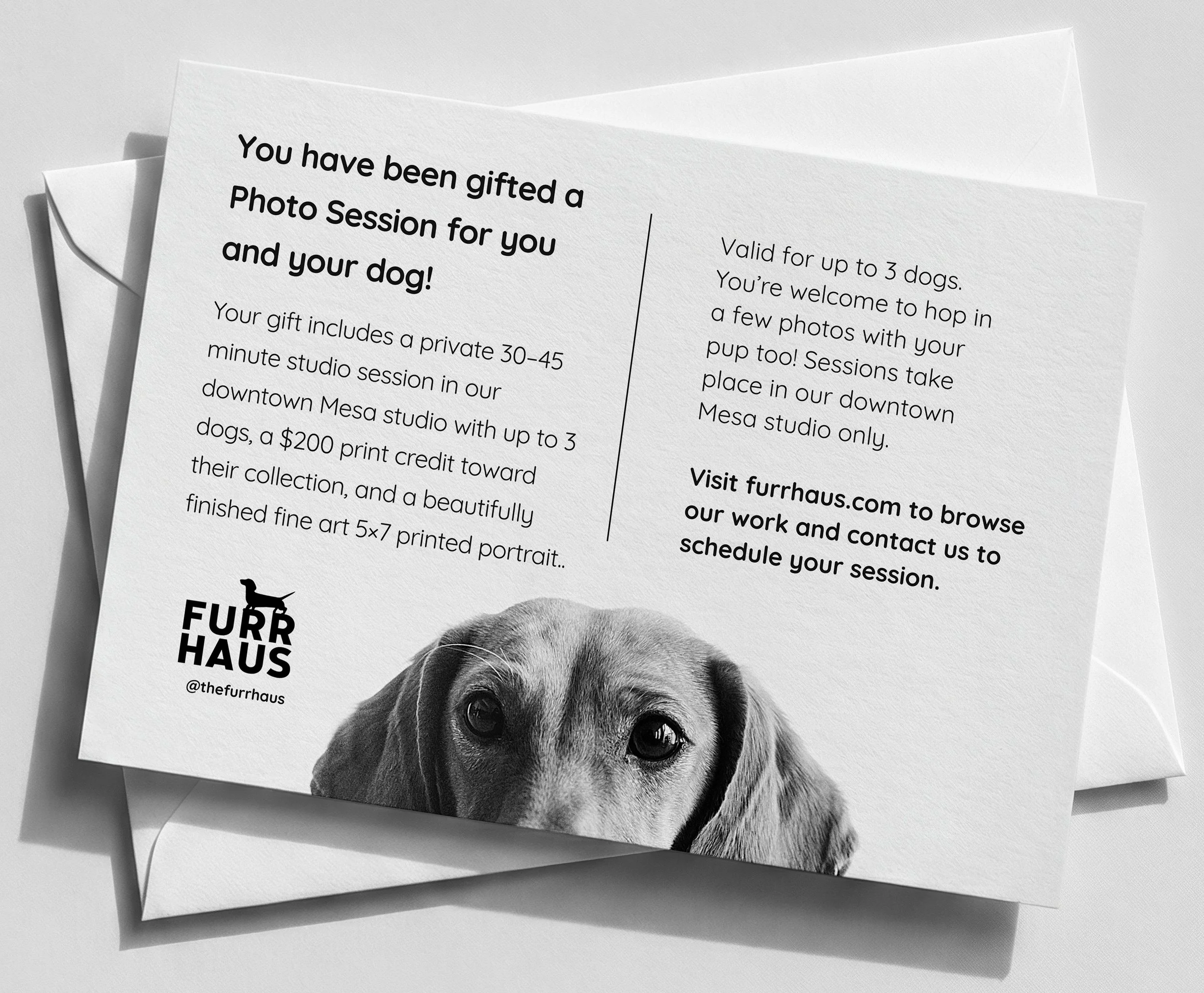 The Furr Haus Gift Card includes a private 30–45 minute studio session in our downtown Mesa studio with up to 3 dogs, a $200 print credit toward their collection, and a beautifully finished fine art 5×7 printed portrait. *see terms below
